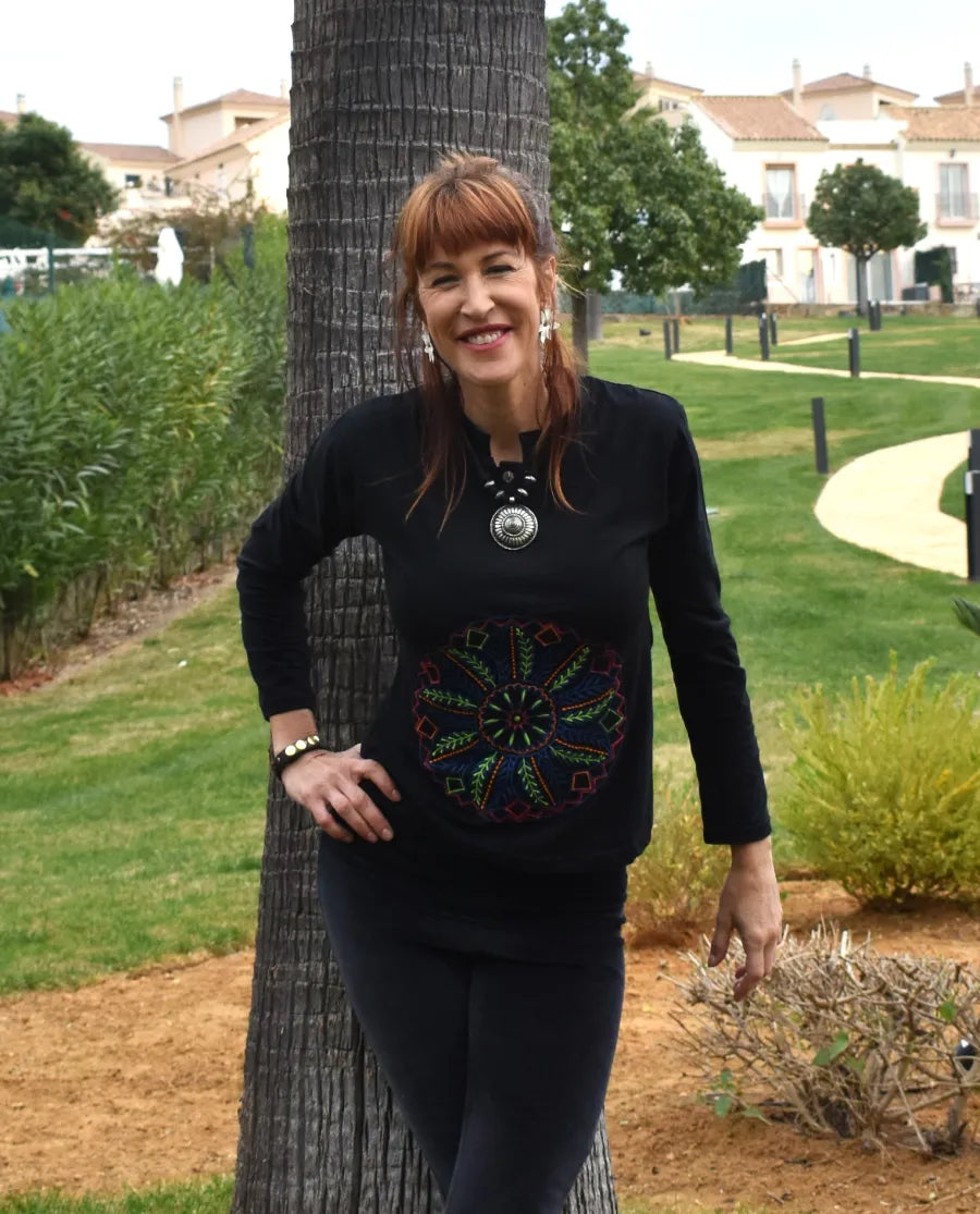 Los mandalas en esta camiseta están bordados a mano y son un símbolo de espiritualidad y arte que nunca pasan de moda. Puedes combinarla con nuestros pantalones de terciopelo, o con tus vaqueros y básicos favoritos para un look sencillo pero con un toque especial.