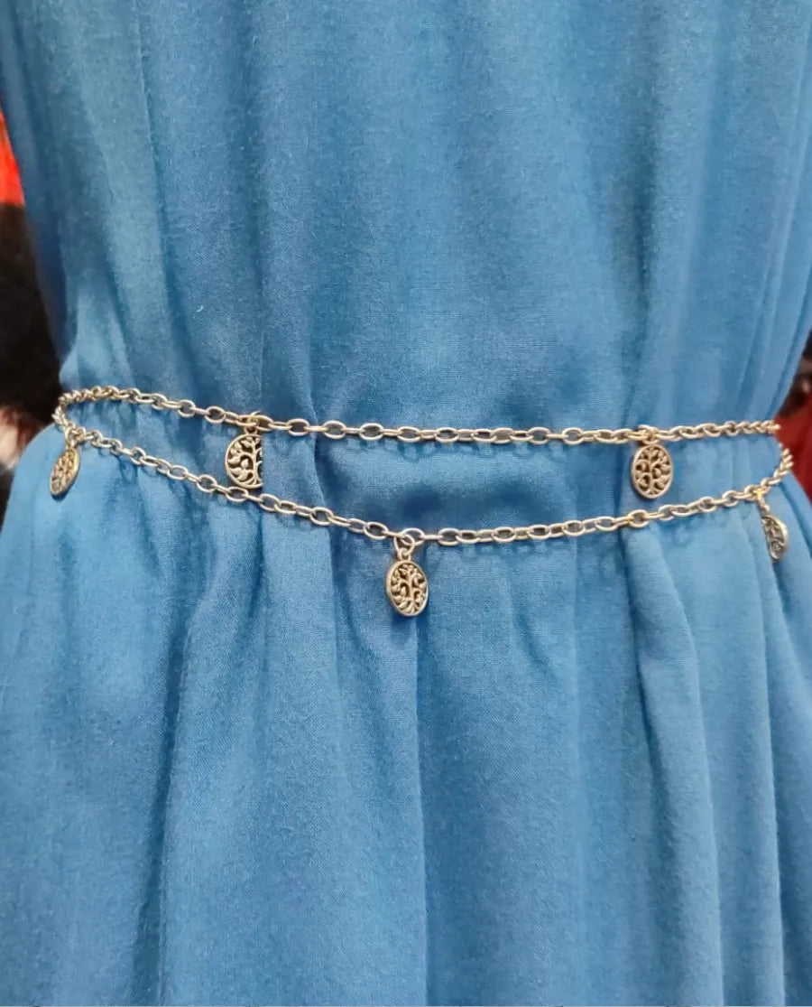 Un accesorio de elegancia sutil que se convertirá en tu complemento favorito. Este cinturón cadena, de 130 cm de longitud, brilla con su acabado plateado y presenta pequeños colgantes con motivos simbólicos como el Árbol de la Vida y el Círculo de la Vida. Perfecto para agregar un toque refinado a tus vestidos o camisolas de seda.