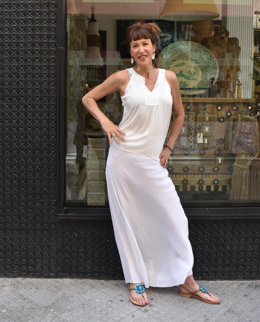 Combínalo con pantalones o una falda al bies para lograr un look vintage y moderno a la vez. Descubre la perfecta combinación de moda y comodidad con nuestro Top "Bali".
